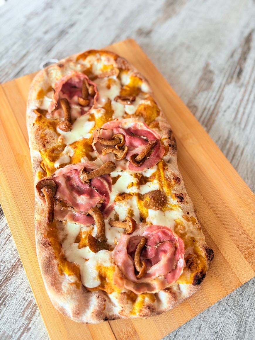 Crema di Zucca, mozzarella, pancetta pepata croccante e funghi chiodini.