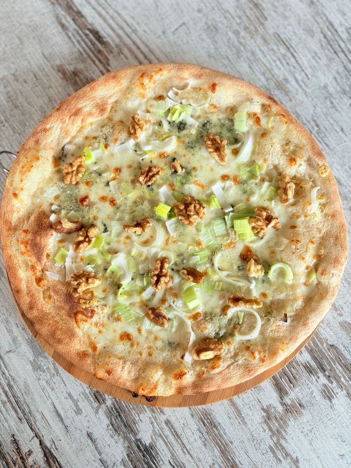 Mozzarella, porri, gorgonzola DOP e noci.