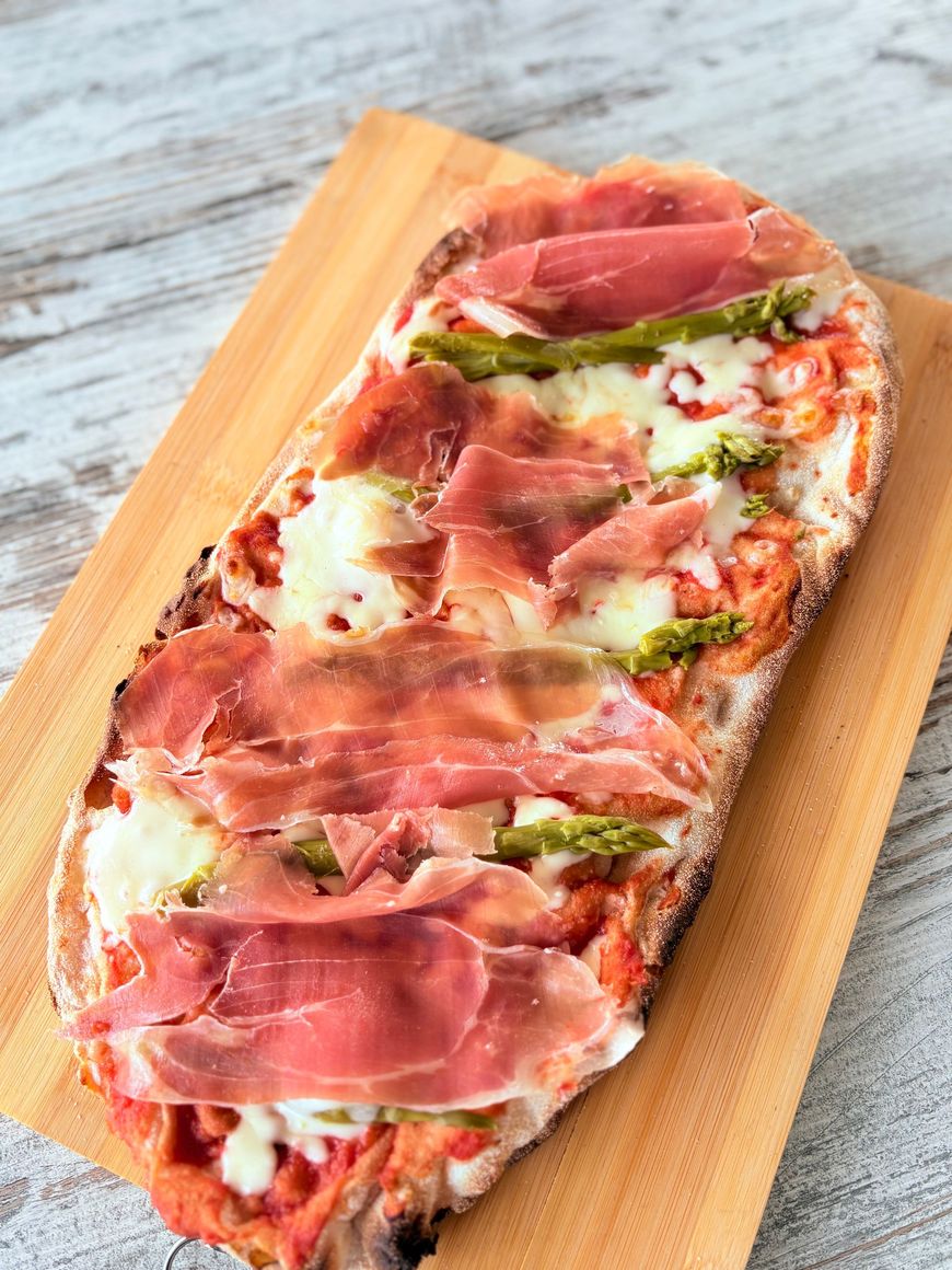 Pomodoro, mozzarella, asparagi, stracchino, crudo.