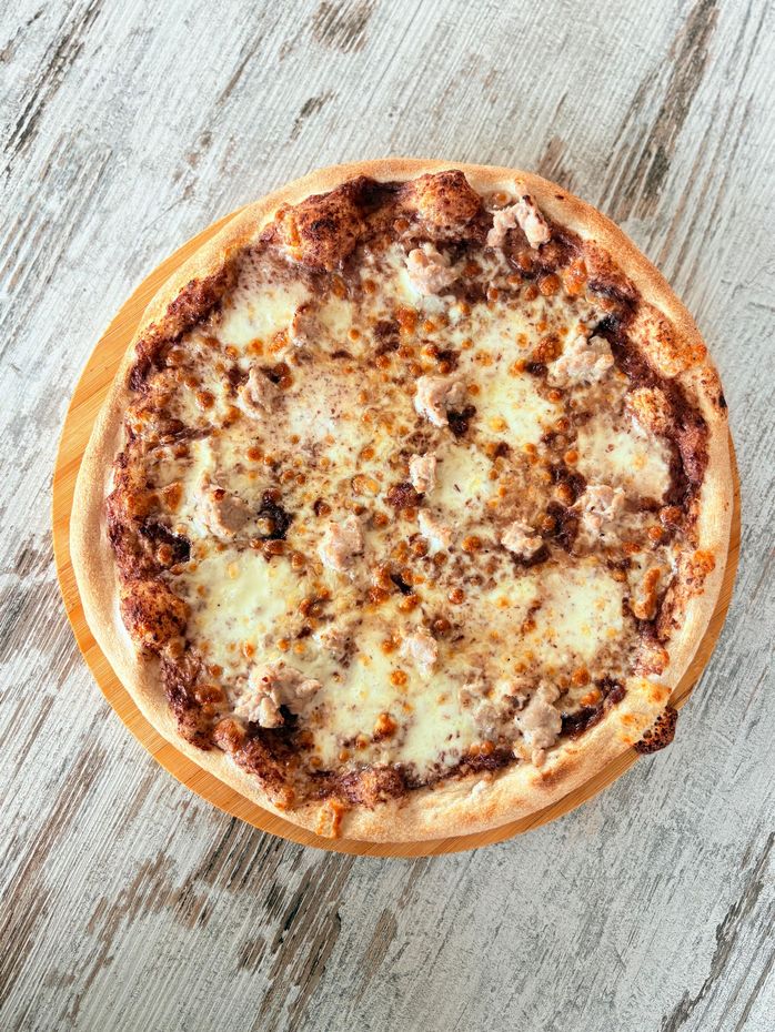 Crema di radicchio, mozzarella, taleggio e salsiccia.