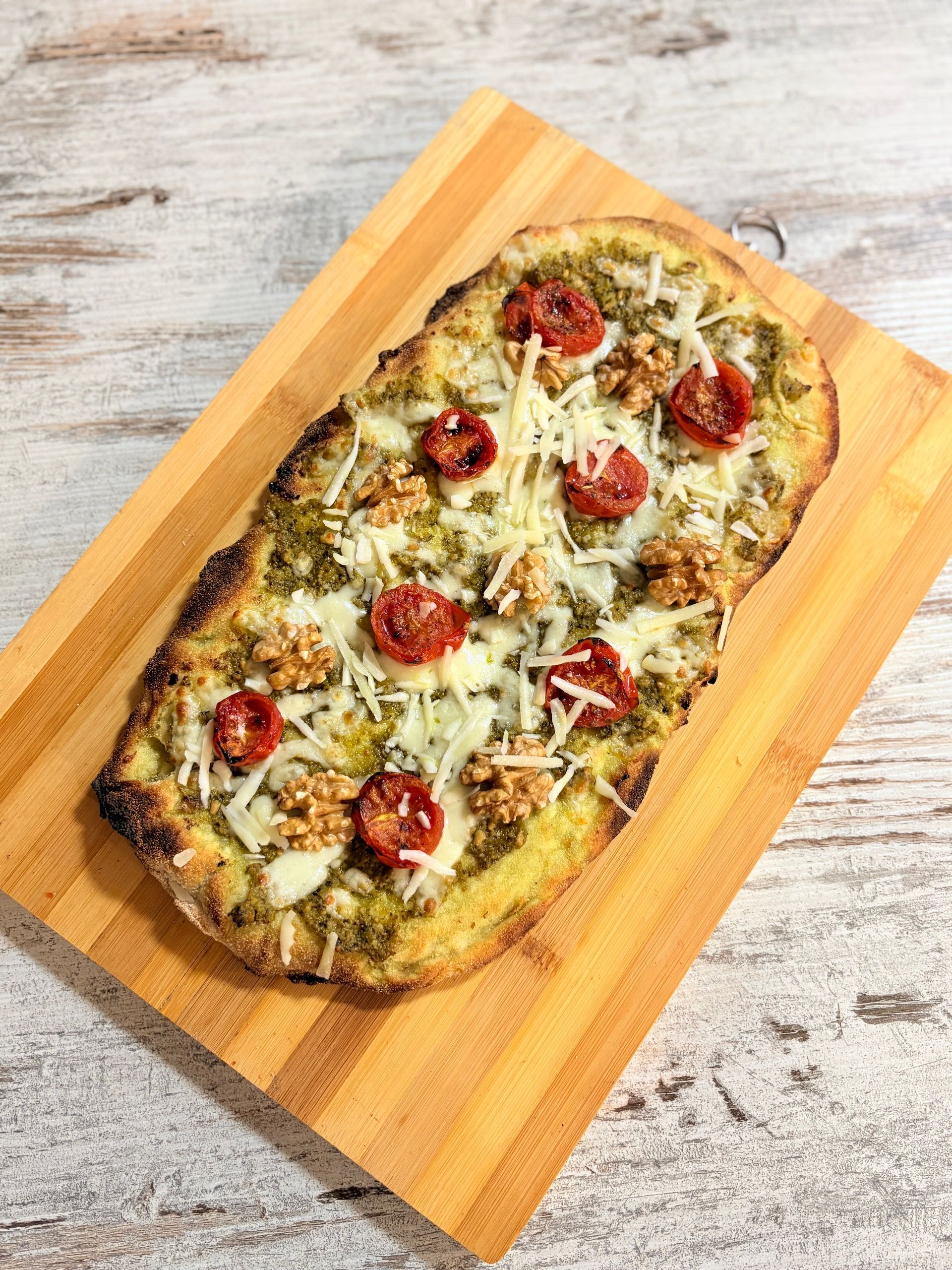crema di basilico, mozzarella, pomodorini confit, noci, pecorino romano.